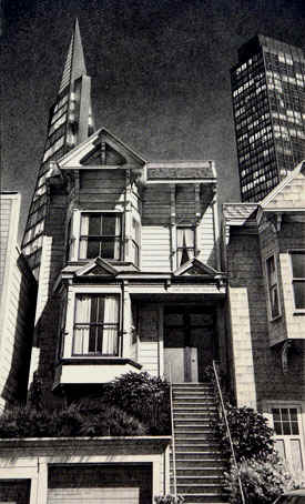 | A esto hay que añadir un lenguaje casi hiperrealista puesto al servicio de unas imágenes cargadas de simbología y con no pocos matices surreales. En la primera, crea una ciudad a partir del barrio de Castro de San Francisco. | ||||||||||||||||||||||||||||||||||||||||