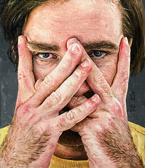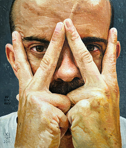 W-DV (Doblemente Vigilados) es una serie de retratos que tienen en común el gesto de taparse la cara con las manos formando la W con los dedos. Gesto de meditación ensimismada, y a su vez de infantil e inútil intento de escondernos y protegernos tapándonos el rostro. W de la omnipresente red informática en un mundo globalizado, que al tiempo que nos conecta, nos controla y nos vigila. Vigilamos y nos vigilan. Doblemente vigilados. |