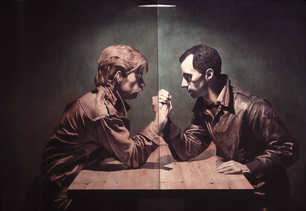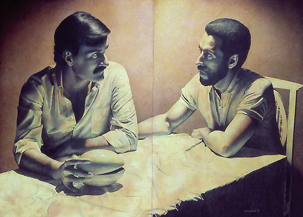 DE QUÉ PAIS ERES TU / PERDIDO ENTRE REALIDADES COMO BOCAS SEDIENTAS 1982 Lápiz / Cartón Daler teñido - Pencil / Tinted Daler board - 65x107 cm. (en 2 piezas)